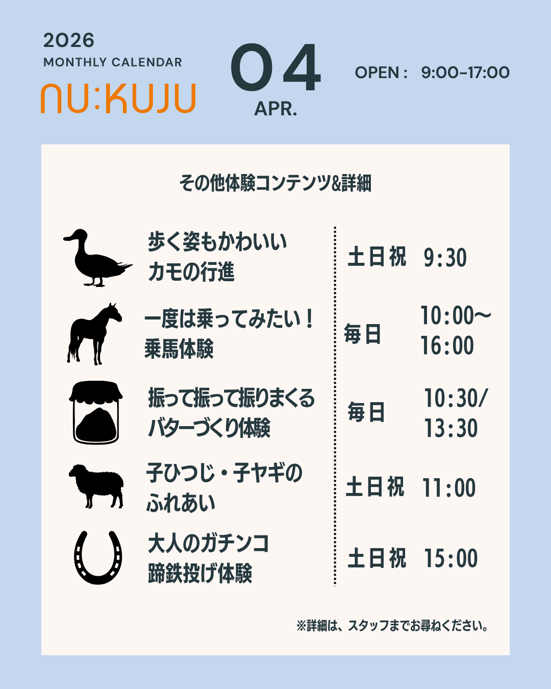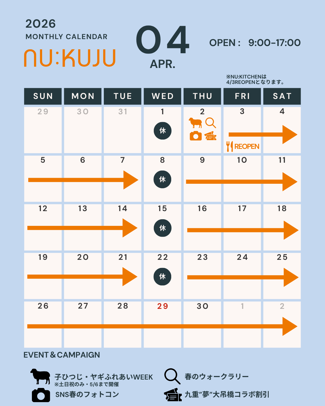 🌸NU:KUJU 4月営業カレンダー公開🌿